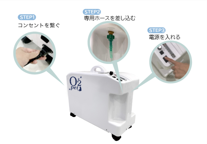 オーツーペットの操作は、電源オン・ケージ接続・ホース挿しの3ステップのみです。設置は5分以内に完了でき、機械が苦手な方や高齢の飼い主さんでも迷わず使い始められます。