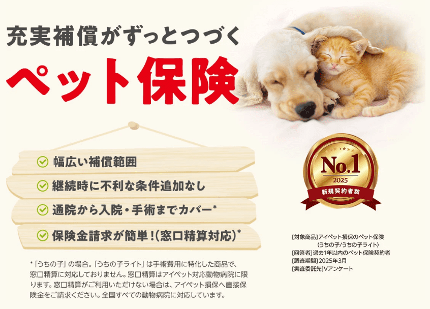 『うちの子』は高齢でも条件を満たせば加入可能な点と、補償内容の広さが魅力です。通院・入院・手術すべてをカバーし、慢性疾患などシニア期に起こりやすい病気にも対応。